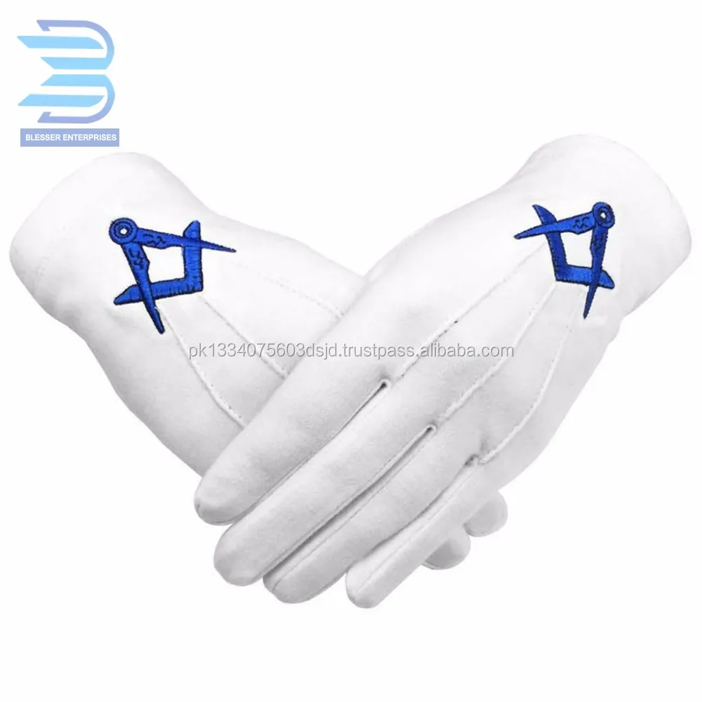 Masonic Gloves Cotton Blue Square and Compass Machine Embroidery