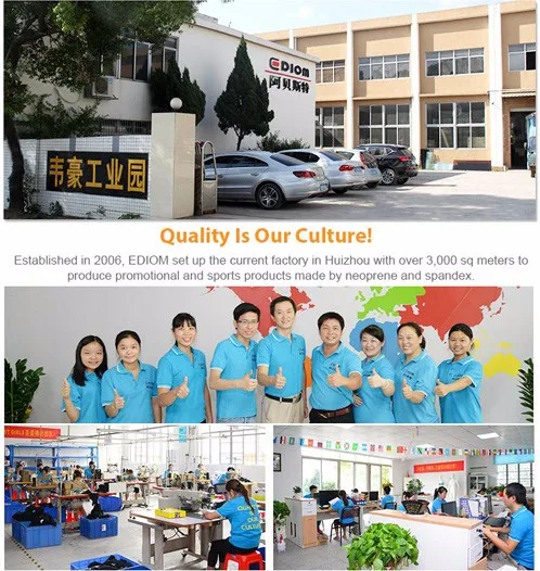 Established in 2006, EDIOM starts from a technology company working with Alipay.com ( a sub-company in Alibaba group ) helping Chinese B2B and B2C companies integrate Alipay in their websites. And in 2008, EDIOM switched to export business for neoprene products and set up the current factory in Huizhou with over 3,000 sq meters to produce promotional and sports products made by neoprene and spandex. High end professional sewing machines like Brother, Toyota, Yamato, Pegasus are operated by very experienced sewing team who spontaneously put quality in the first priority. All production procedures are fully under control so patents or custom designs are very well protected. Clients always buy with confidence.