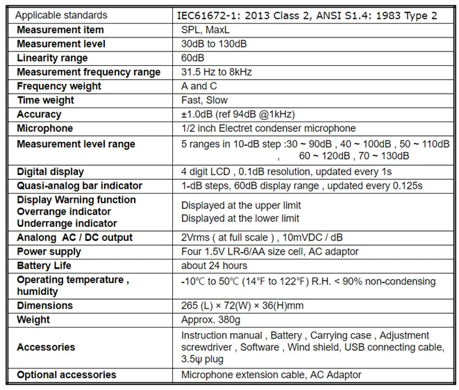 · Compliant with IEC 61672-1 class2 standard · Easy to use for Maximum level and Peak level can be measured · simultaneously · Dynamic range of 60dB · Five range from 30 to 130db · A&C Frequency Weighting · Fast/Slow dynamic characteristic · 200M Records Data logging function(micro SD card 4GB) · USB interface · Sound level Alarm output · Real time clock with calendar · Positioning tripod stand(optional) · Calibration(optional) |