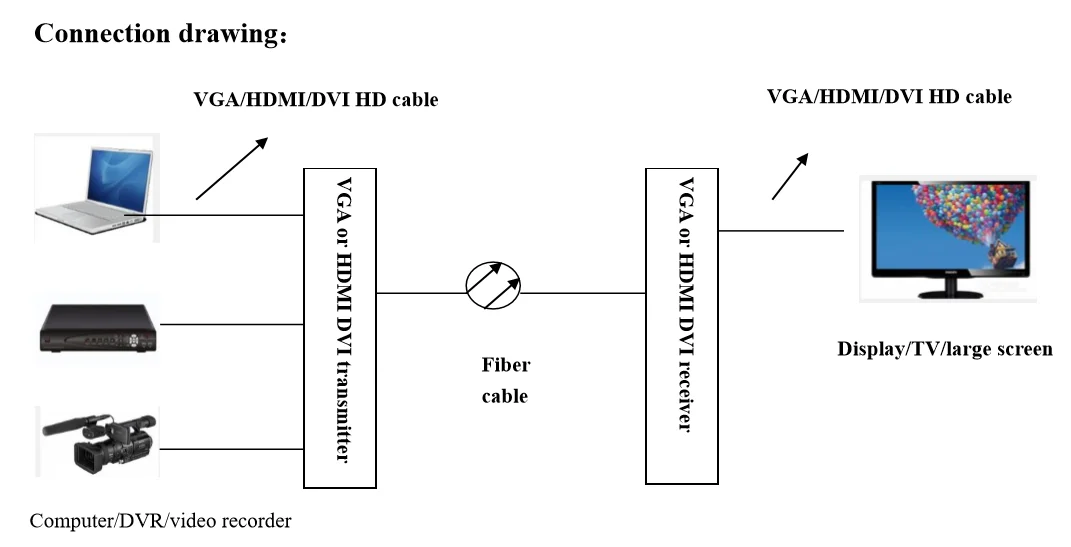 This product is composed of transmitter and receiver. It can extend the audio, video and USB of the mainframe computer or video recorder to the far-end through a single optical fiber cable. The user will receive the image and the sound of the computer for real time at the far end and also can use the computer. In the same time, the user can also use the computer at the near end.