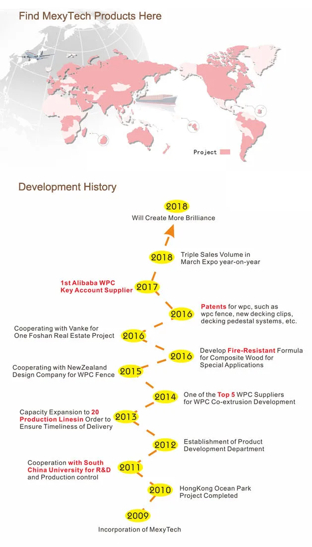 MexyTech Co., Ltd have been in wpc business for 10 years. Through 10-years development and research, We have been one company combine R&D, design, production, recycle, marketing in one. Nowadays, MexyTech have 60 production lines and R&D testing lab and our products are popular to many countries.