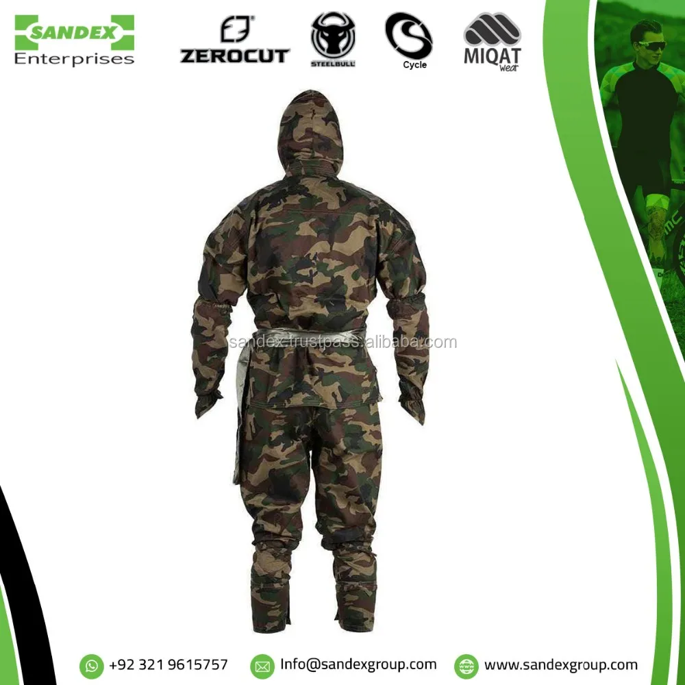 Customary wrap over jacket incorporating secret pocket. Trousers have calf ties and traditional ties to the waist. Includes inner and outer hood, gauntlets, hand cover gloves and sash.