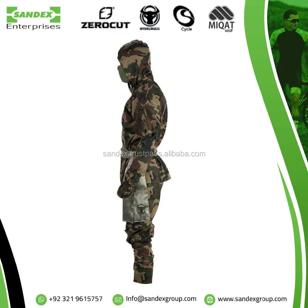 Includes hood, jacket, trousers, gauntlets, hand cover gloves and sash belt.