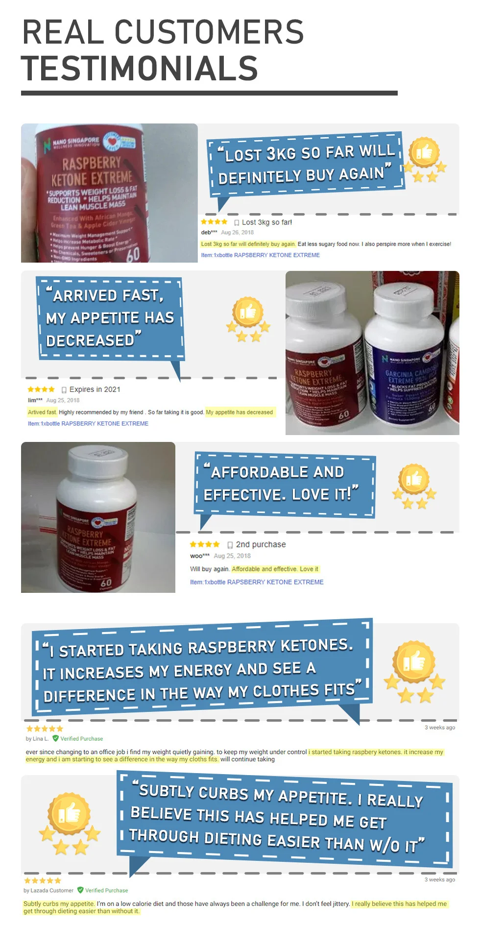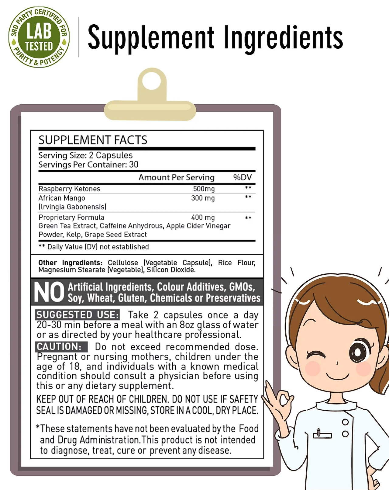 Ingredients | Raspberry Ketones. African Mango(Irvingia Gabonensis), Proprietary Formula Green Tea Extract, Caffeine Anhydrous, Apple Cider Vinegar Powder, Kelp, Grape Seed Extract Other Ingredients: Cellulose(Vegetable Capsule), Rice Flour, Magnesium Stearate(Vegetable), Silicon Dioxide | ||||