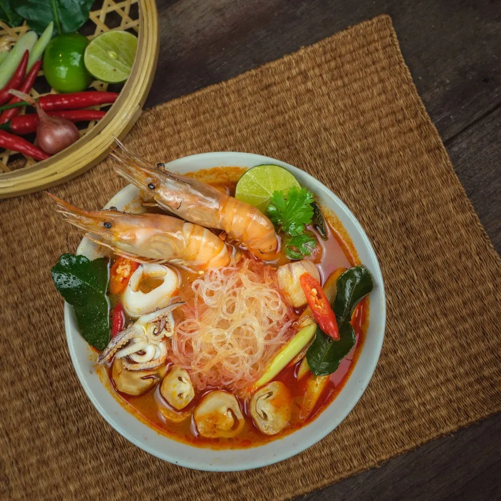 Tom Yum is one of the most popular Thai food, and is well known among foreigners. Ingredients include herbs such as galangal, lemongrass, kariff lime leaf and chili. These ingredients make Tom Yum a very healthy dish. Tom Yum soup is also known to be full of flavors, but not too spicy.