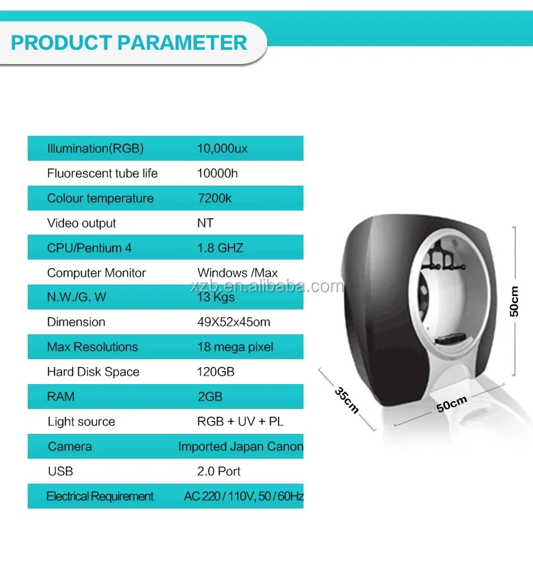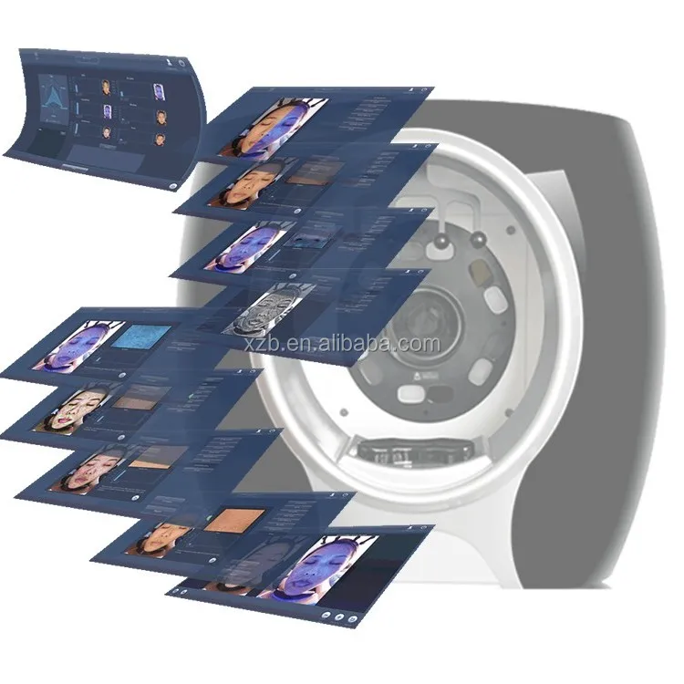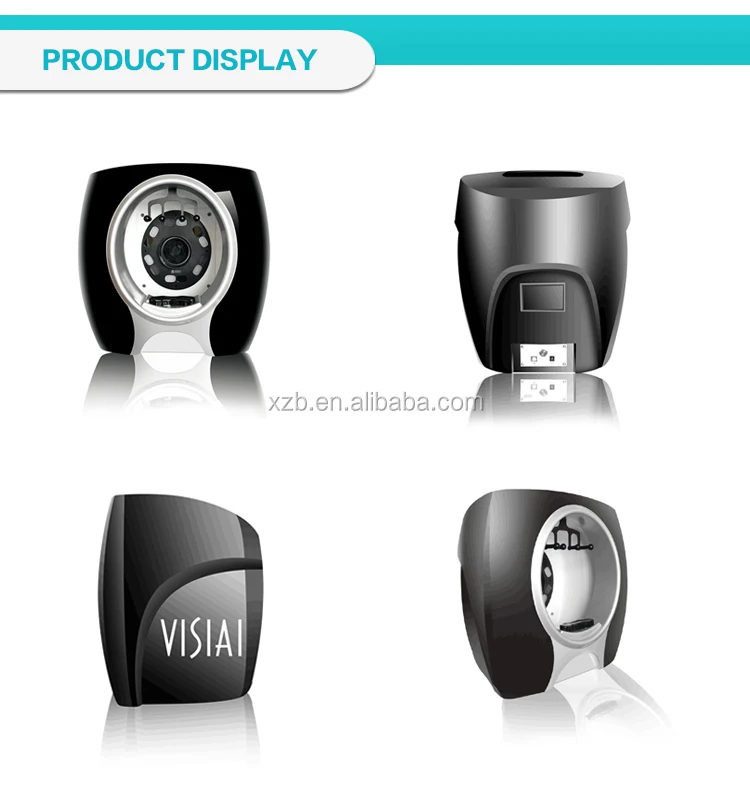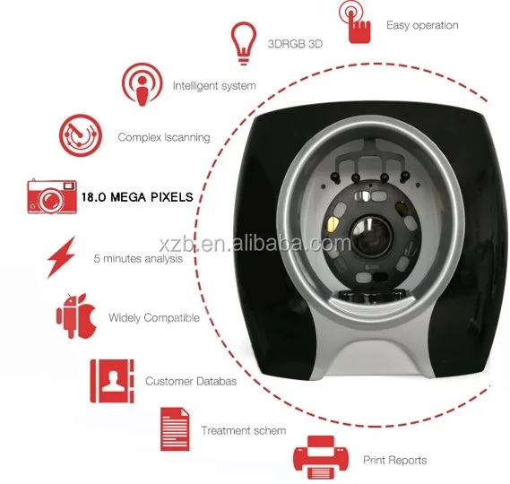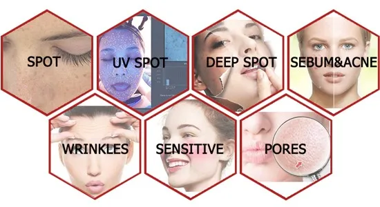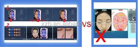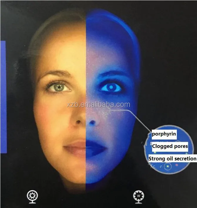 The Skin Analyzer System own two special lighting systems (RGB +UV) and smart skin analyzer software that allows two images (before and after beauty care) can be compared side by side, which is very different visual effects to be felt. Once the Skin Analysis System emits visible RGB light and safe UV light to the skin, various chromophores in skin cells respond to the light differently send back remitted light. The reflected light is captured by the digital camera and analyzed by software for the light absorbed at various wavelengths, then the images created from computer analysis show the skin condition and future prediction.