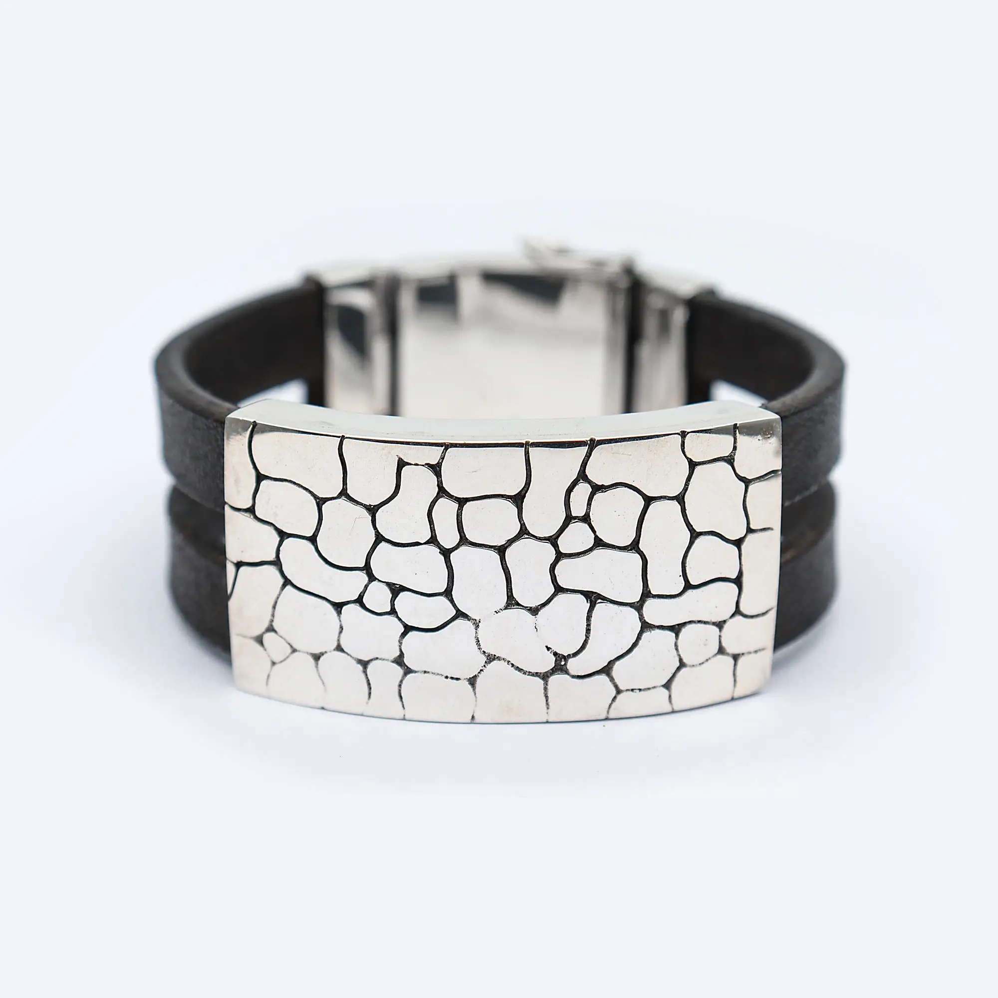 The black braided leather strap with artistic and exquisitely crafted silver addition, sets this bracelet apart with it's minute, beautiful details. The silver and black combination is eye catching and has a lavish vibe of it's own.