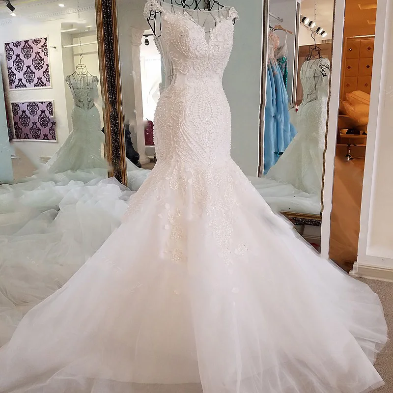 HTL132 long beaded sleeves vestidos de novia bride 2019 designs detachable train mermaid wedding dress bridal gown
