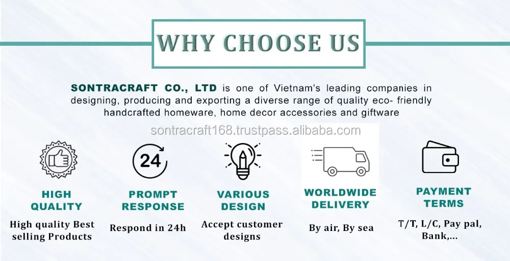 SONTRACRAFT., LTD is one of Vietnam's leading companies in designing, producing and exporting a diverse range of quality eco- friendly handcrafted homeware, home decor accessories and giftware. Our products use environmentally friendly processes, sustainable natural resources and recycled materials such as natural lacquer resin, bamboo, rattan, MDF, mother of pearl, recycled eggshell, coconut shell, etc. or of a combination of such materials. These products come in a wide range of styles, colors, finishes and sizes. Our products are created usually by hand or using traditional methods.