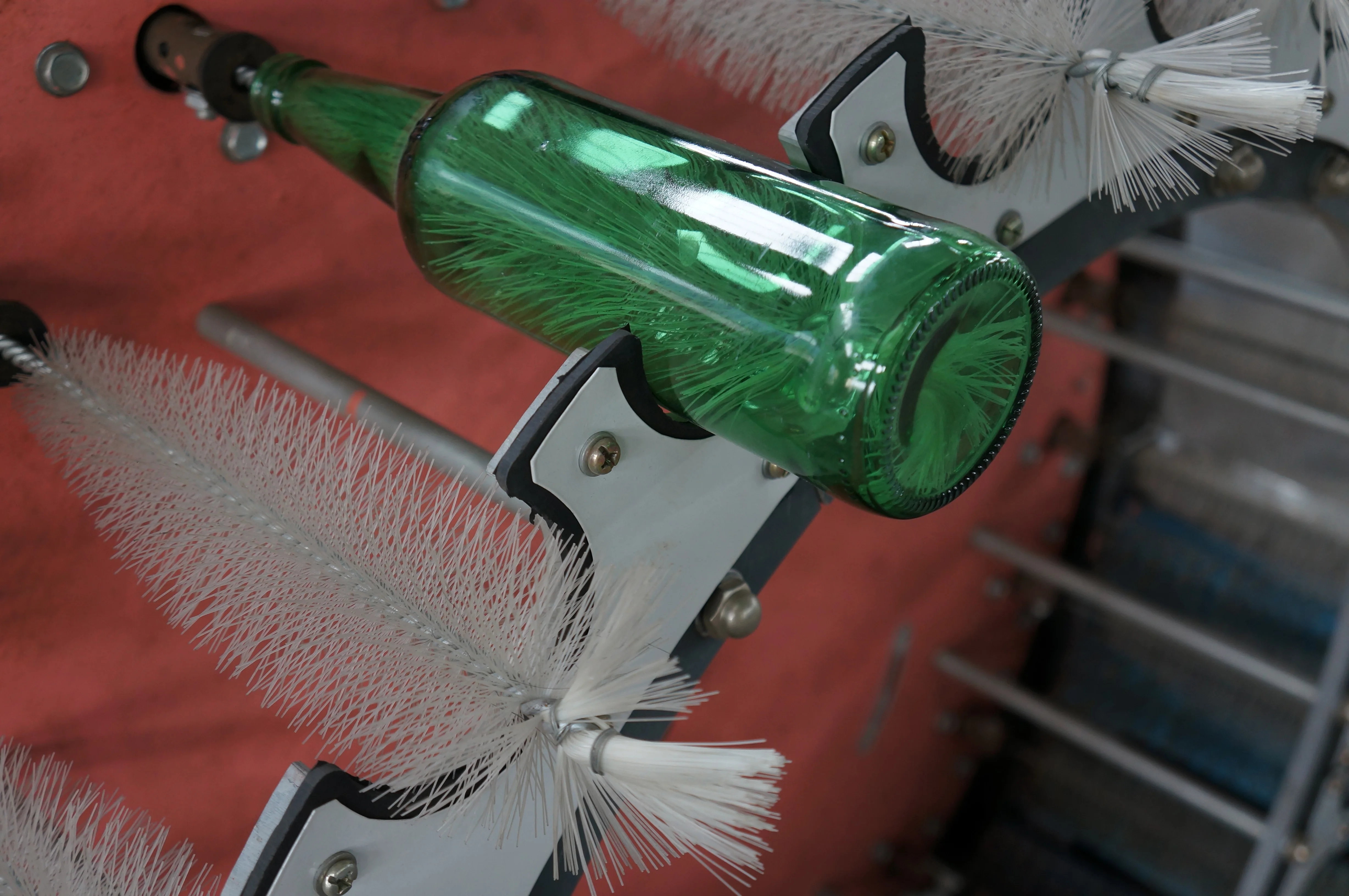 This washing machine is especially used for round recycled glass bottles inside and outside brushing, especially for inside brushing. It can be also used to remove easy removing paper label; The bottles should be soaked into the water for some time before washing with the recycled bottles. The bottle should be filled with water, wine, juice or other beverage washing liquid. The material is high quality of stainless steel, meets the requirement of food grade. One machine is suitable for different size bottle when with the same bottle neck. The structure is easy and beautiful. Easy operate and maintenance, good efficiency.
