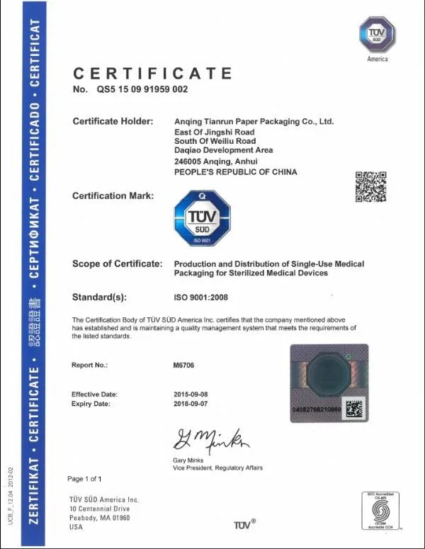 Anqing Tianrun Paper Packaging Co . Ltd was founded in 2003 and is the key enterprises in the oldest , national fixed-point R D , production , sales as one of the packaging of plastic medical devices , has a long history , strong technical strength .The square of the factory is around 75000 m², and we currently have a 300,000 grade sterile workshop as well as more than 20 production lines , which have automatic bag making machines , flexo printing machines , gra - wure printing machines , coating laminating machines , cutting machines and so on . Now Tianrun has more t an 300 employees ( include 80 Technical professionals and quality inspection persons ) and the manufacture capacity of 500000 pieces every day and a yearly sales volume of 30000 . 000 dollars . Our company improved a strict scientific management system , established the specialized laboratory and equipped a full set of testing equipment And already attained certifications of Iso9001 ,Iso13485 ,ISO11607,FDA,CE etc.