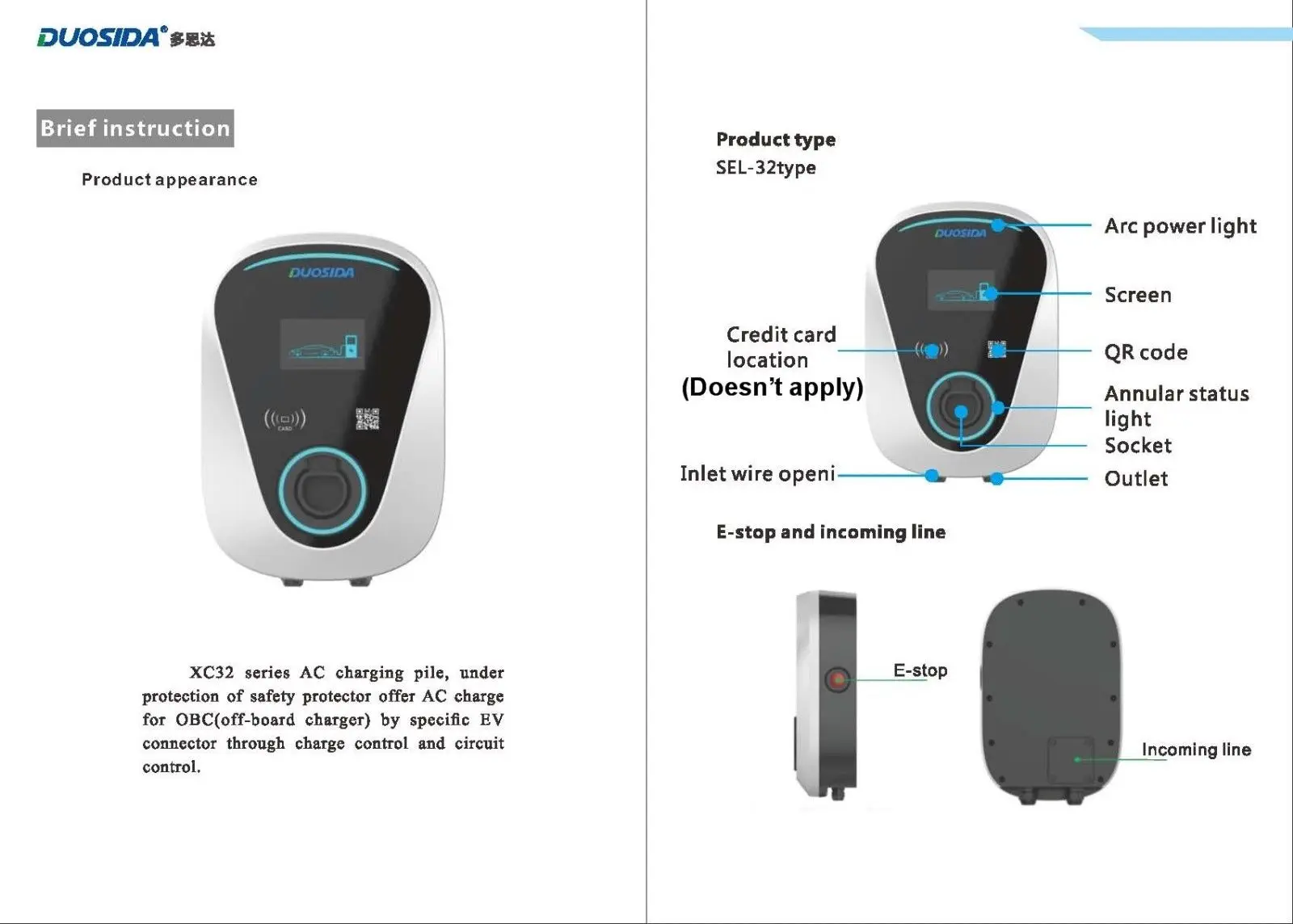 The DUOSIDA XC32-S electric vehicle charging station (EVSE) charges all SAE J1772-compliant vehicles including both electric vehicle (EV) models like the Nissan LEAF and BMW i3 or TESLA (need adapter)as well as plug-in hybrid (PHEV) models like the Toyota Camry or Ford Fusion