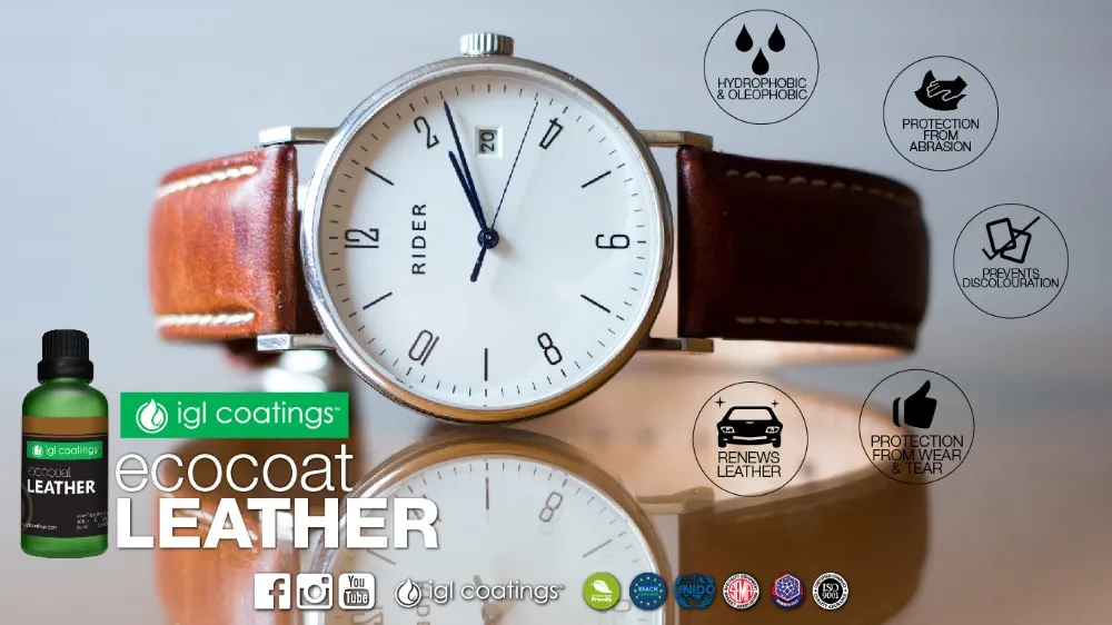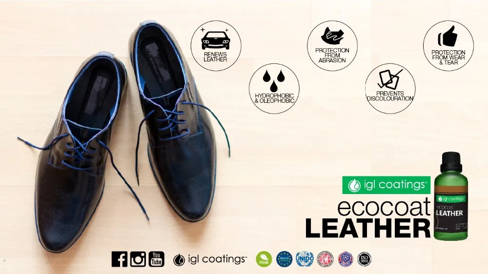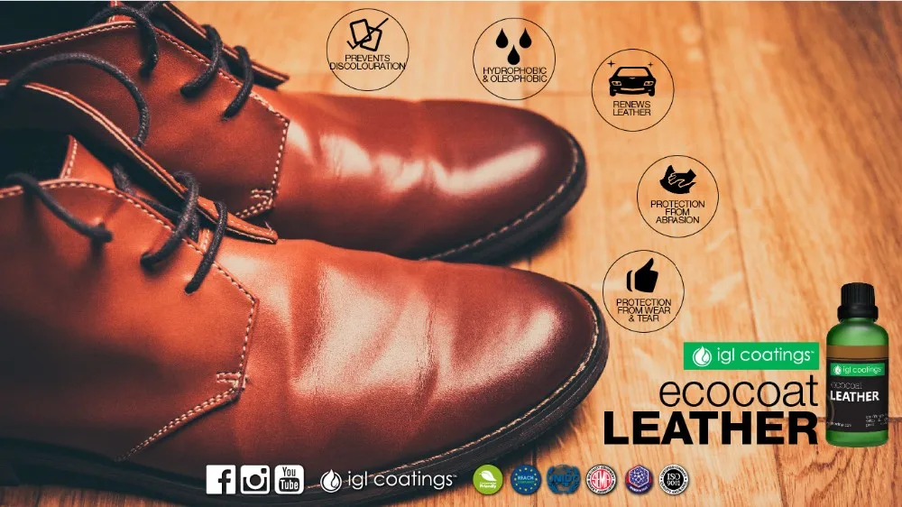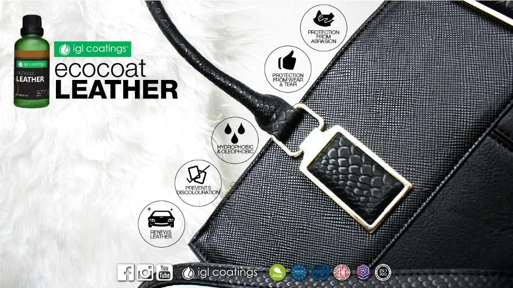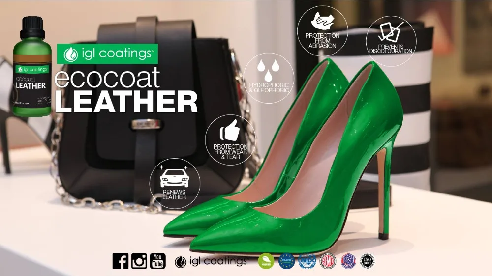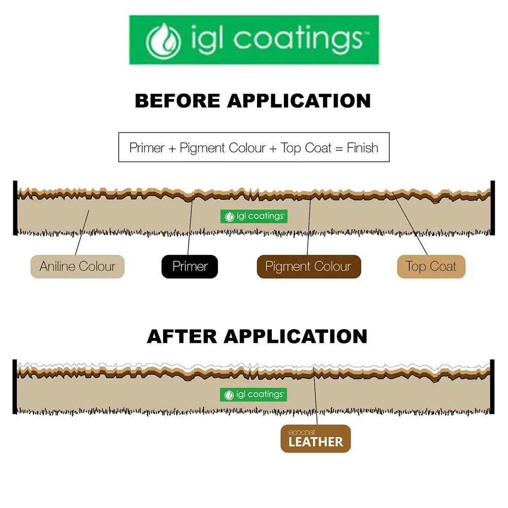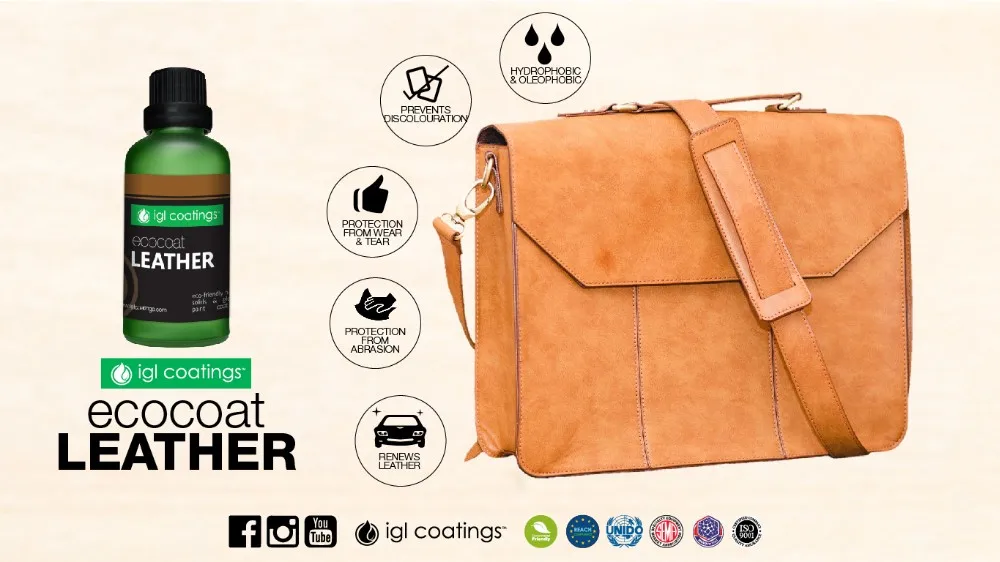 Ecocoat Leather is a REACH compliant 100% breathable, low VOC, non etching silica coating. It crosslinks with the surface of the leather via nanotechnology to create an invisible layer that repels undesirable liquid, dirt, dye and UV-radiation. It can be applied on virtually any leather. The result is protection against unwanted liquids, dirt and stains without altering the flexibility, appearance or texture of the coated surface.
