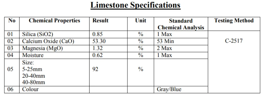 | Specification | SiO2:0,85%; CaO: 53,30%; MgO: 1,32%; Moisture: 0,62% |
