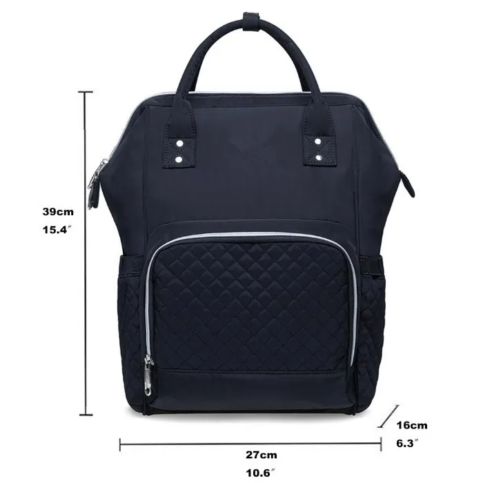 PLENTY SPACE & GOOD ORGANIZATION:Dimensions:10.6*6.3*15.4in(L*W*H).Weight:1.65LB.Capacity:16.6L.This large capacity nappy bag has many different function pocket built in, which can meets all the demands of a mommy or a daddy,bottles, clothes, towels and diapers can be easily organized.The front pocket can hold three bottles and meanwhile preserve the heat of the milk bottle for about 2-4 hours.Several pockets inside the backpack can easily organized different baby staff.