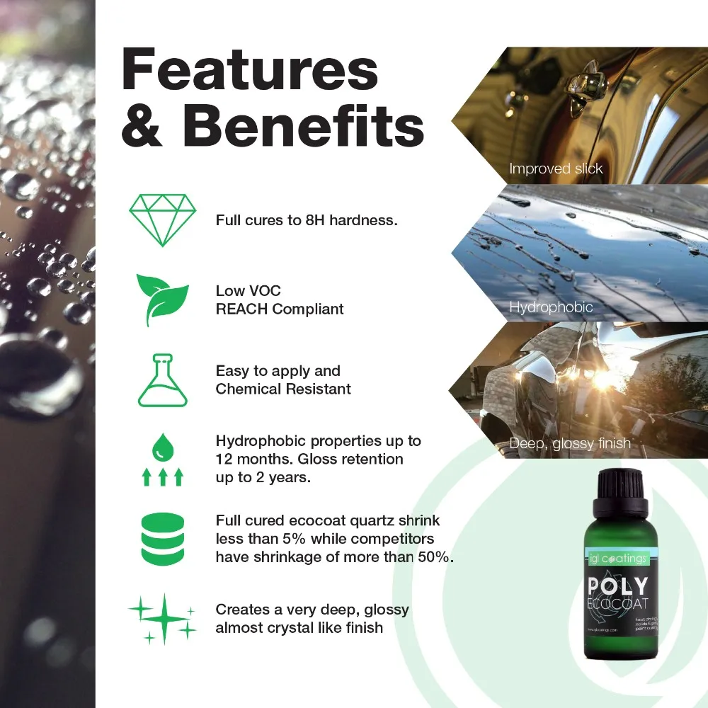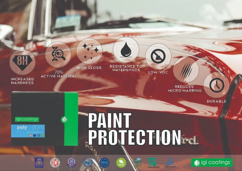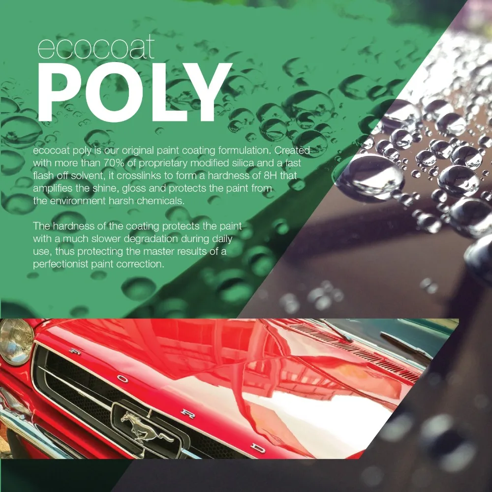 Ecocoat Poly is our original REACH compliant high solid ceramic coating which is synthetised with our proprietary modified active material, carrier and nanotechnology to be free from any carcinogenic chemicals. The result is an increase in the paint's reflectivity and also resistance against harsh chemicals, micro marring and dullness that last up to 1 year.