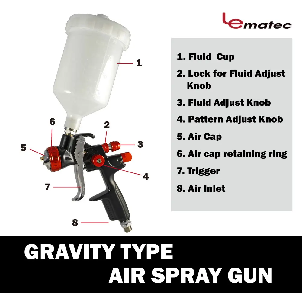 Fluid Tip Size(I.D.):∅2.5 mm Air Pressure:1.5-2.0 Bar Air Inlet:1/4" Fluid Inlet:M16*1.5 Air Consumption:250 L/Min Weight (G) / With Cup:425/600 Capacity OF Cup:0.6 L Type Gravity Type
