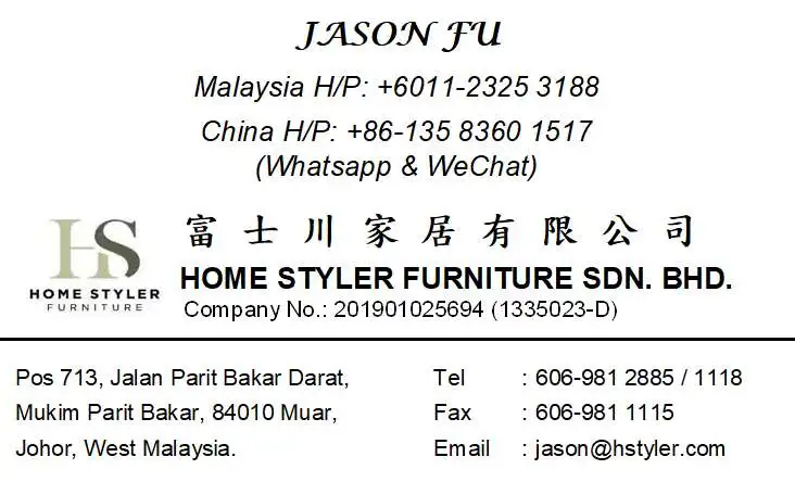 Home Styler Furniture is located in Muar Malaysia,the branch company of Shandong Fushi Wood Group.We have over 900 employees, covers 30,000 square meters workshops and our fixed asset investment is 15,000,000 USD, total value 12, 000, 000RM per year. Our main market is USA, Canada,Japan, South Korea, South East Asia, Middle East, Europe and so on.