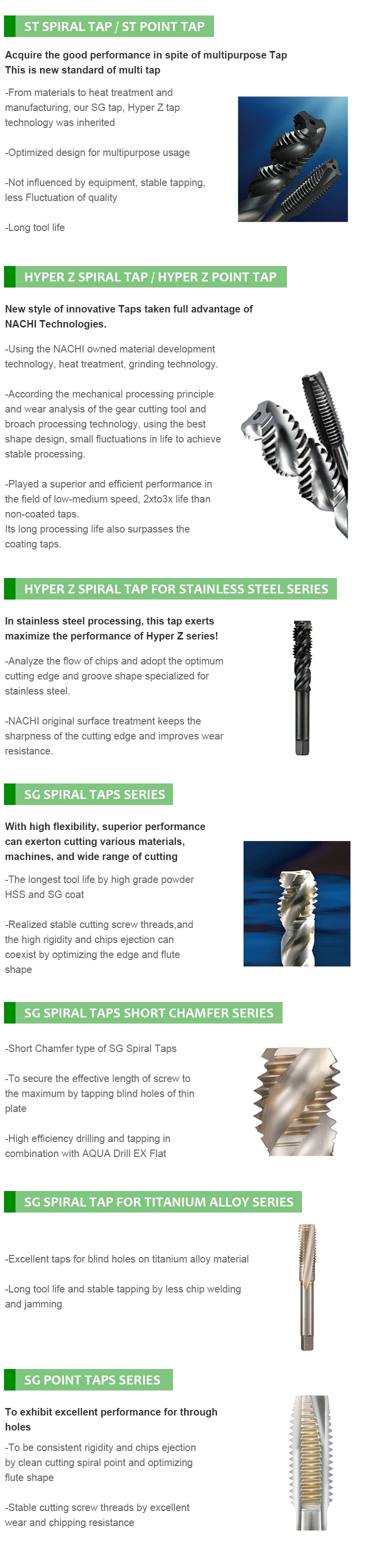 • SG Spiral Taps Short Chamfer series | • SG Spiral Tap for Titanium Alloy series | ||||||