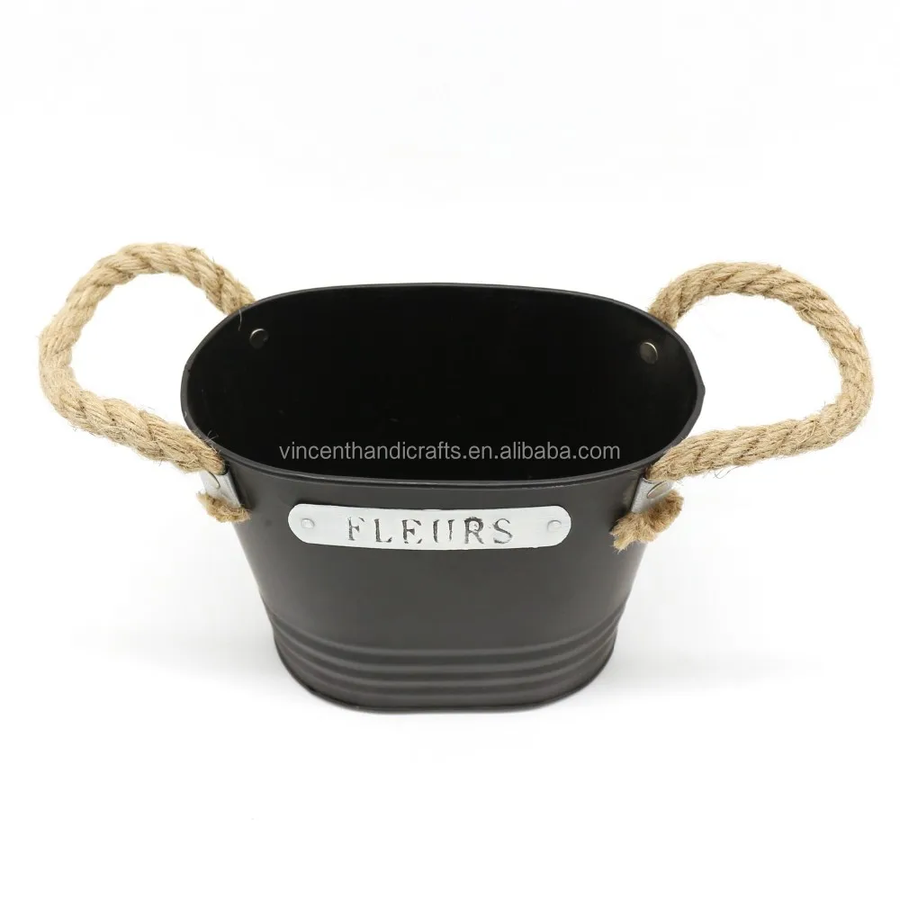 Primitive Matt Black Metal Tin Planter with Hemp Rope handle, Rustic Oval Metal Flower Pot Garden Bucket for Indoor or Outdoor Décor. 7-1/2 X 4-1/4 X 5-1/2 Inch