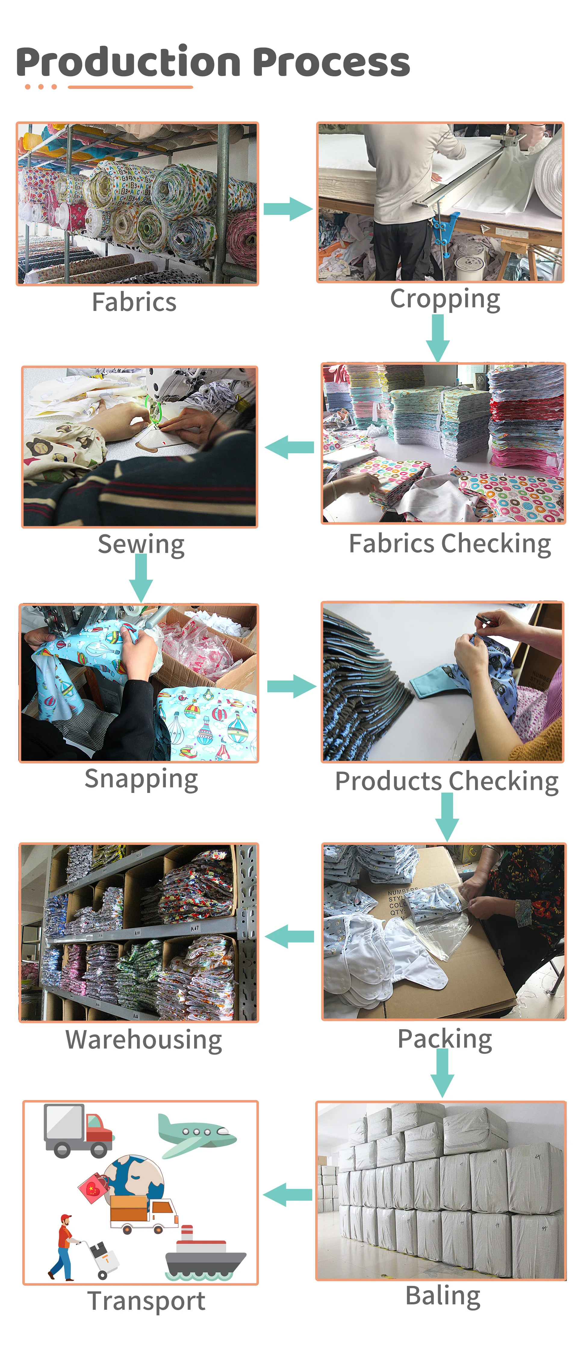 A:Our factory has 9 years experience in cloth diaper manufacture. And all of our workers have 5 years experience in baby cloth diaper. We check the finished diaper and other items one by one, make sure the quality is good.