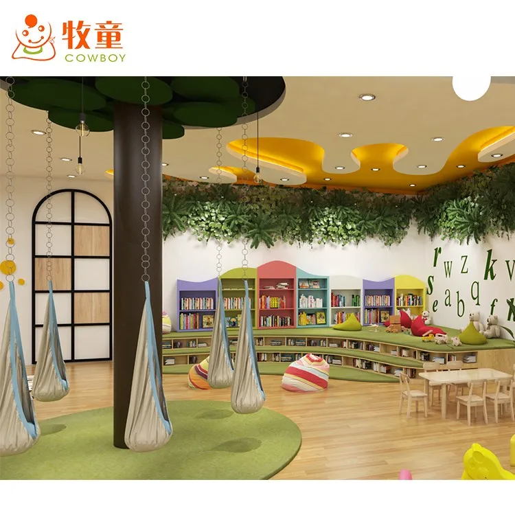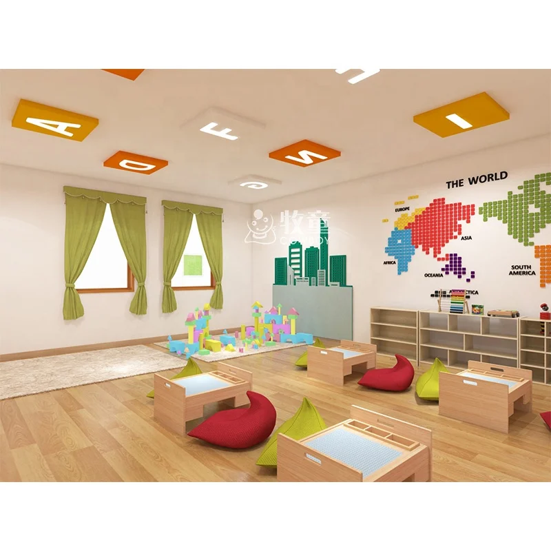 Combine reading corner, math corner, language corner, art corner, building blocks corner together, creat an functional and attractive learning place for children. Material are made of natural wood, which is green, safe and comfortable for children.