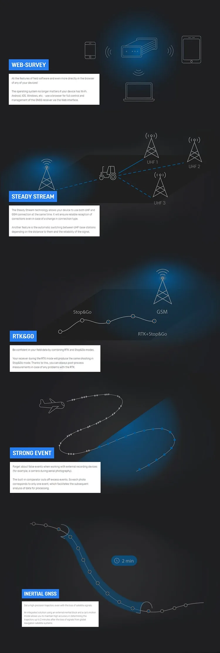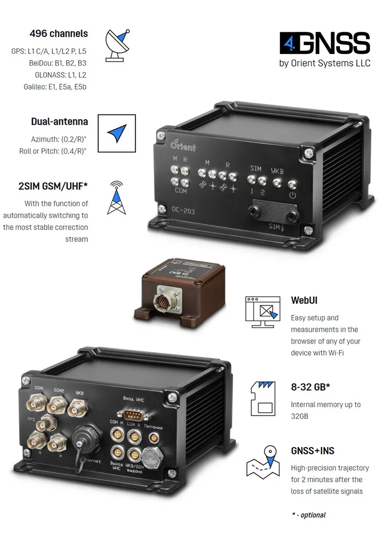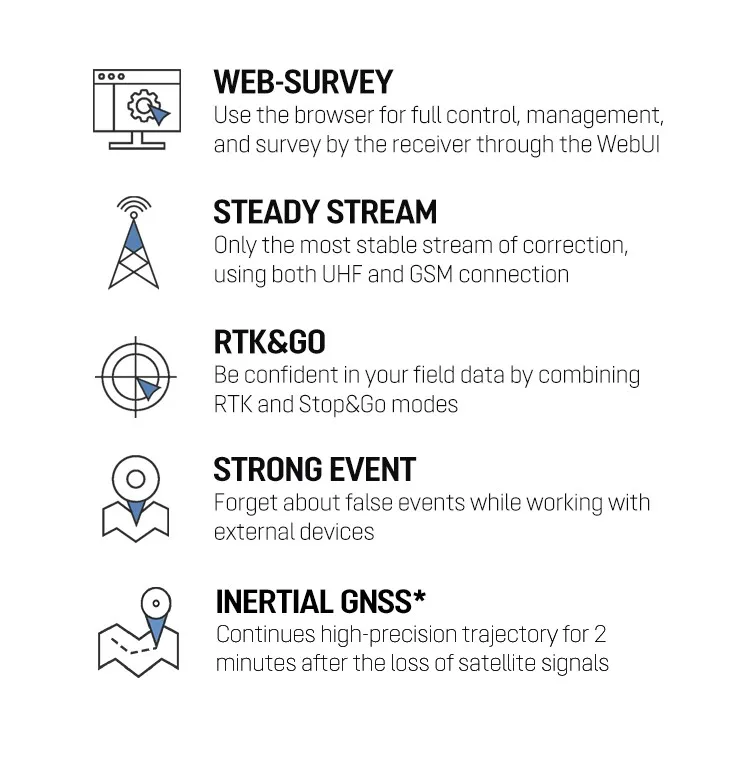 Measurements are recorded in the internal memory of 8 GB (up to 32 GB). Supports RTCM 2.x, 3.x, CMR corrections. Raw data is easily converted to RINEX by the receiver's internal WebUI or PC free utility. WebUI to configure and control the receiver.