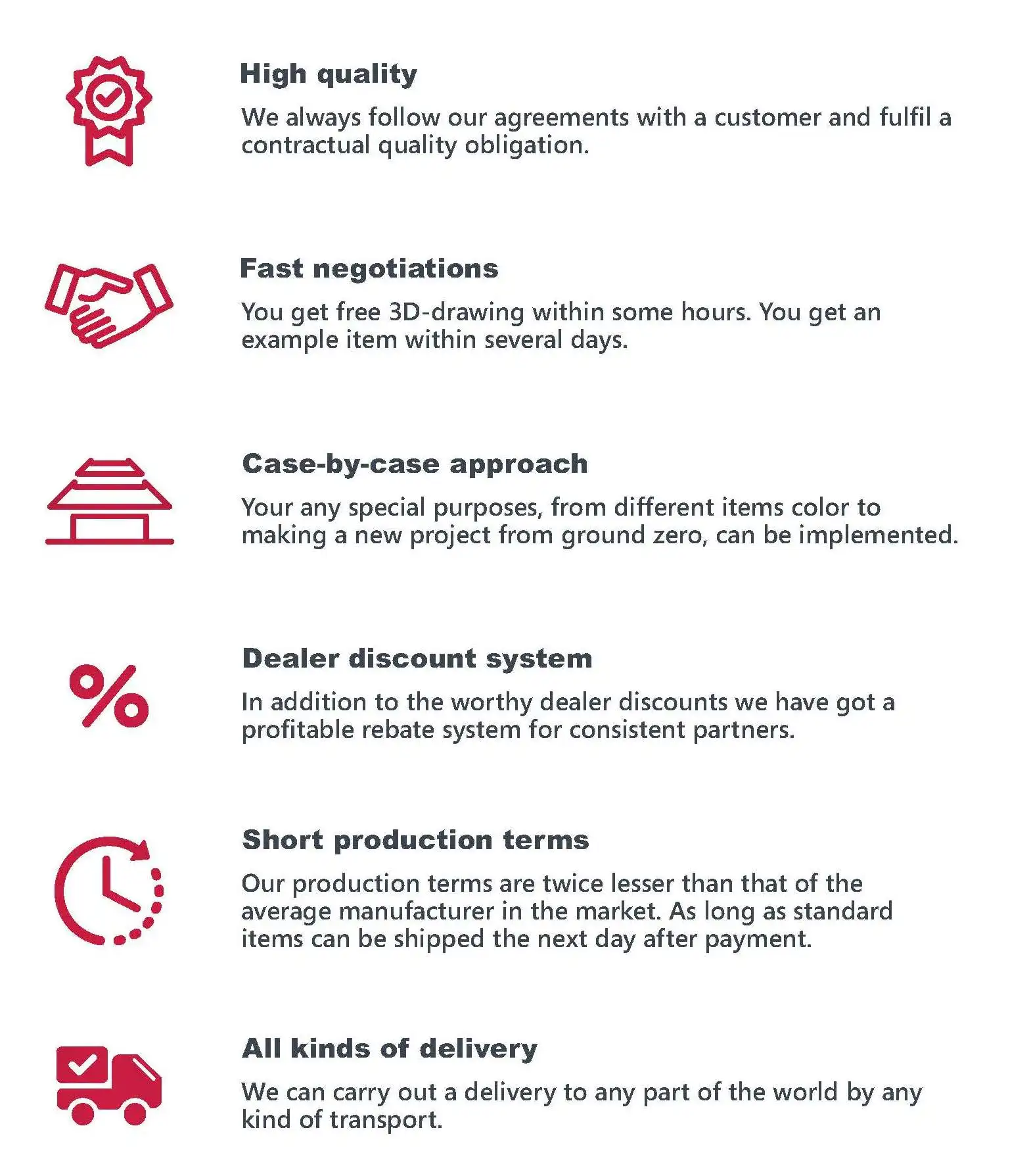 A: some standard items are available, so the delivery period starts from 3 days. Other items need to be manufactured and the lead time can be up to 15 days depending on the volume.