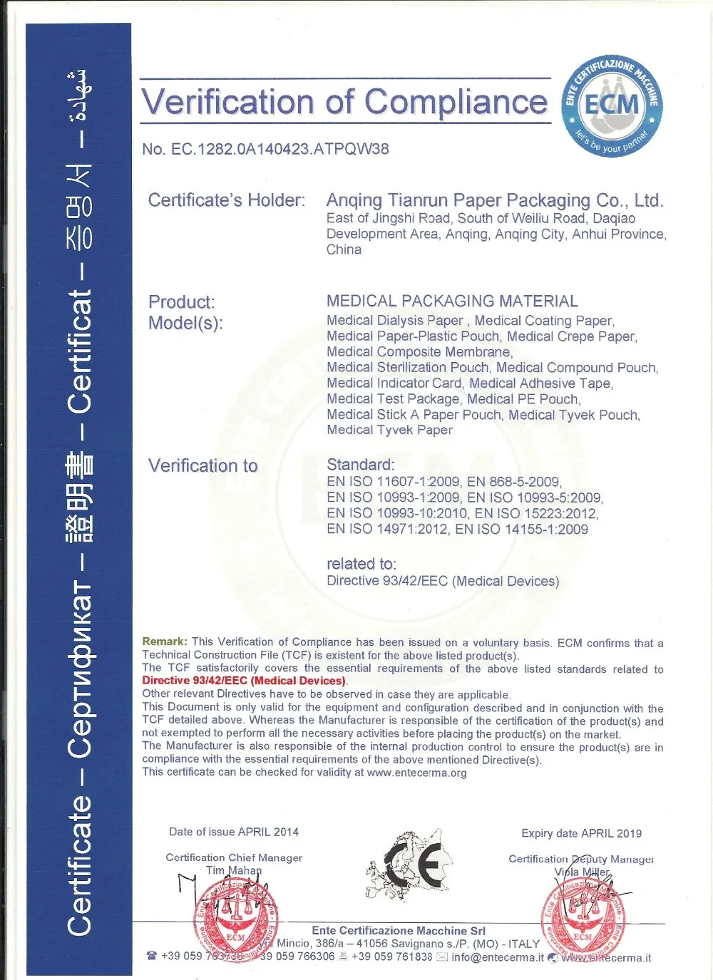 guideline, we got ISO 13485 and CE certificate.