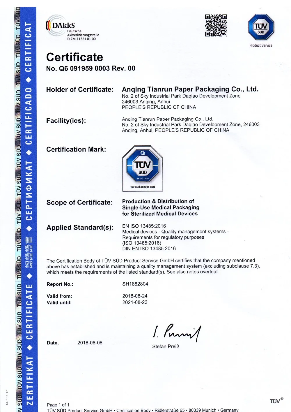 We have established good and long-term stable cooperative relationship with enterprises in over 40 countries and regions in the Middle East , South America , Europe , and Asia since its inception . Our company always adhere to the concept of de - Card ( STEAM , EO , FORM , relopment , " people-oriented , scientific and technological innovation " . The leader of medical packaging field , Anqing Tianrun Sincerely look forward to cooperating with you for long-term , and achieve a win-win situation.