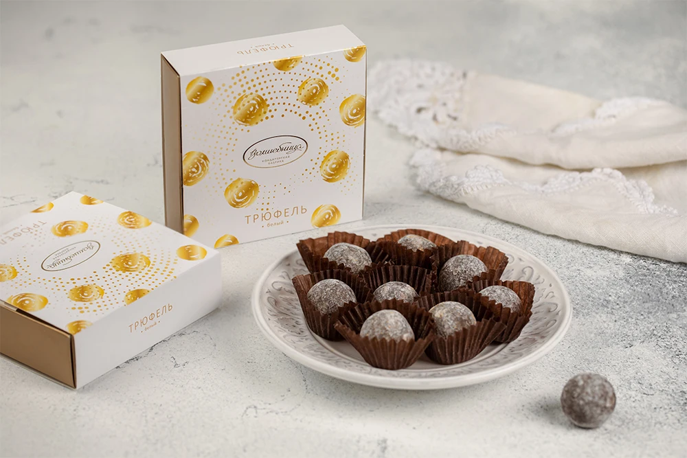 Truffles "White" are round, puffy truffles, covered with delicate powder like snow. An elegant gift to create an atmosphere of celebration and magic.