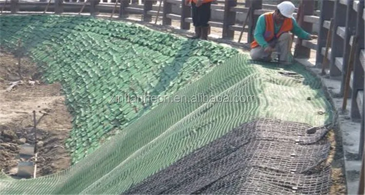 3D Erosion Control Mat consisting of the UV material, extruded fiber core withe the warp-knitting net or geogrid on one side. Or with the non-woven geotextile on two sides. It is good for the erosion control and water filter.which can protect the ground surface being corroded before the turf is growing up, and fix the seeds.The compound protection layer formed after the grass grows up can endure washing by high level and high speed water. It can be a substitute of the concrete, bitumen, stone etc to be the slope protection material. It has mainly been used in highway, railway, riverway, embankment, hillside etc