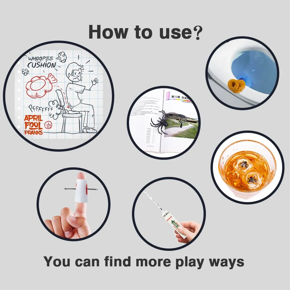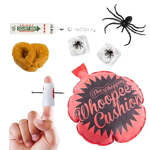 HIGH VALUE : Set of 6 , Include Party Pooper , whoopee cushion,flies in ice cubes,Shocking Gum,nail through finger and fake spiders