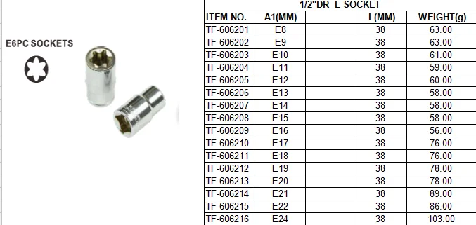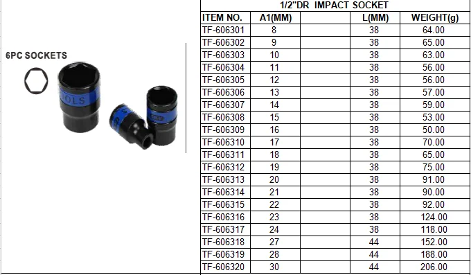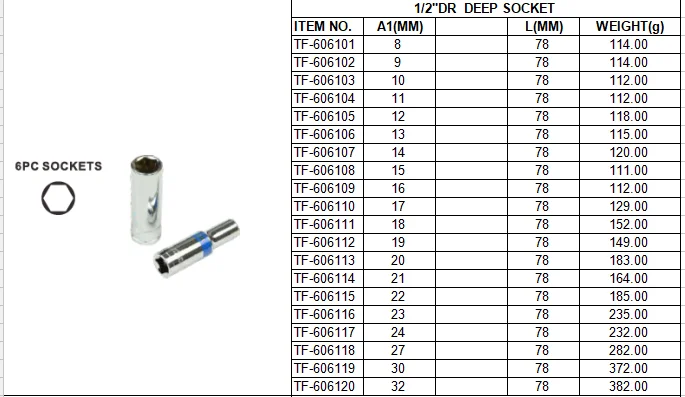 The sizes are: 1/4",3/8",1/2" series, including:8,9,10,11,12,13,14,15,16,17,18,19,20,21,22,23,24,27,30,32mm