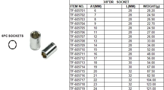 The normal socket are the 6PT, 12PT, Dr socket, Deep sockets, ratchets, handles, etc