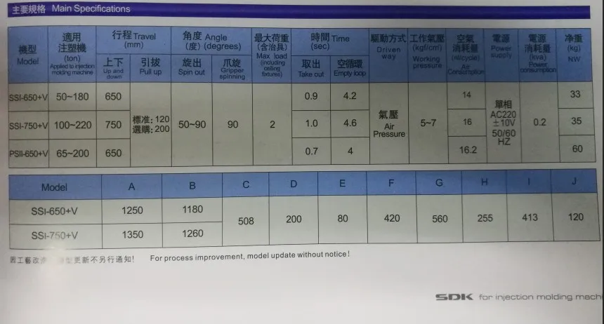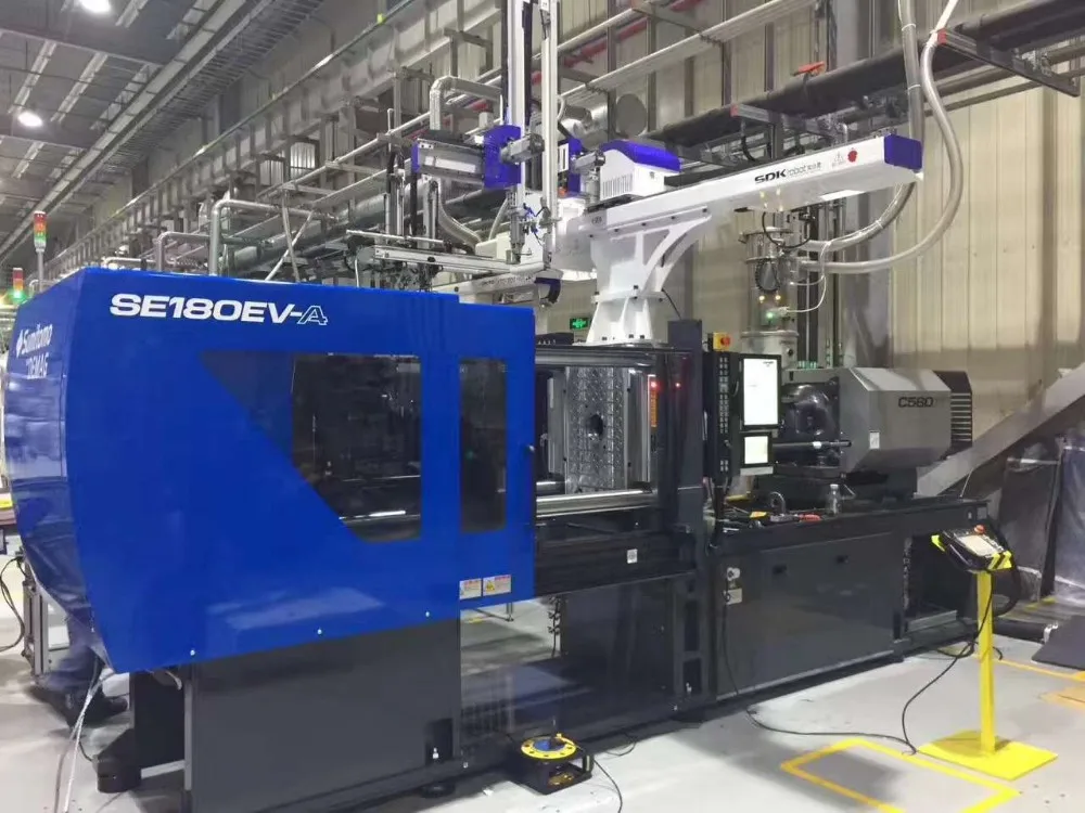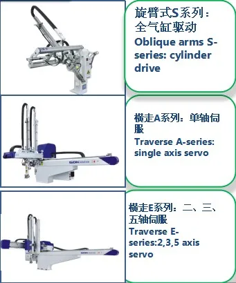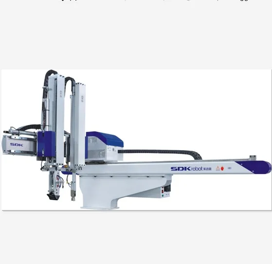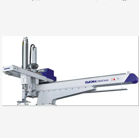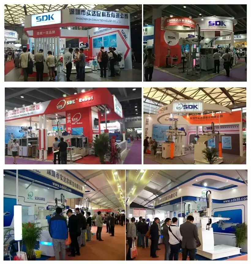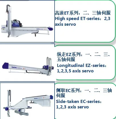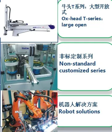 SDK produces oblique arm robot, horizontal robot, high-speed tau robot, large five-axis servo manipulator, conveyor belt, receiving station and other peripheral, fully meeting the demands of injection molding machine from 50 to 4,000 tons.