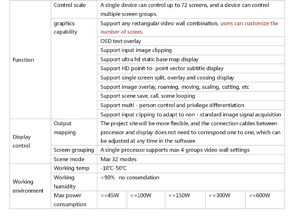 10.Support video wall grouping mode, max support 4 groups split screens. .Each group of screens can independently set parameters such as resolution,row and column, and support independent storage and invocation of scenes.