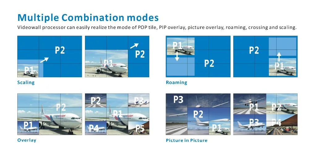 4.Support signal source group, it can control multiple video wall groups with different resolution. It is with function of windowing, overlay, stretching, scaling, PIP and roaming.