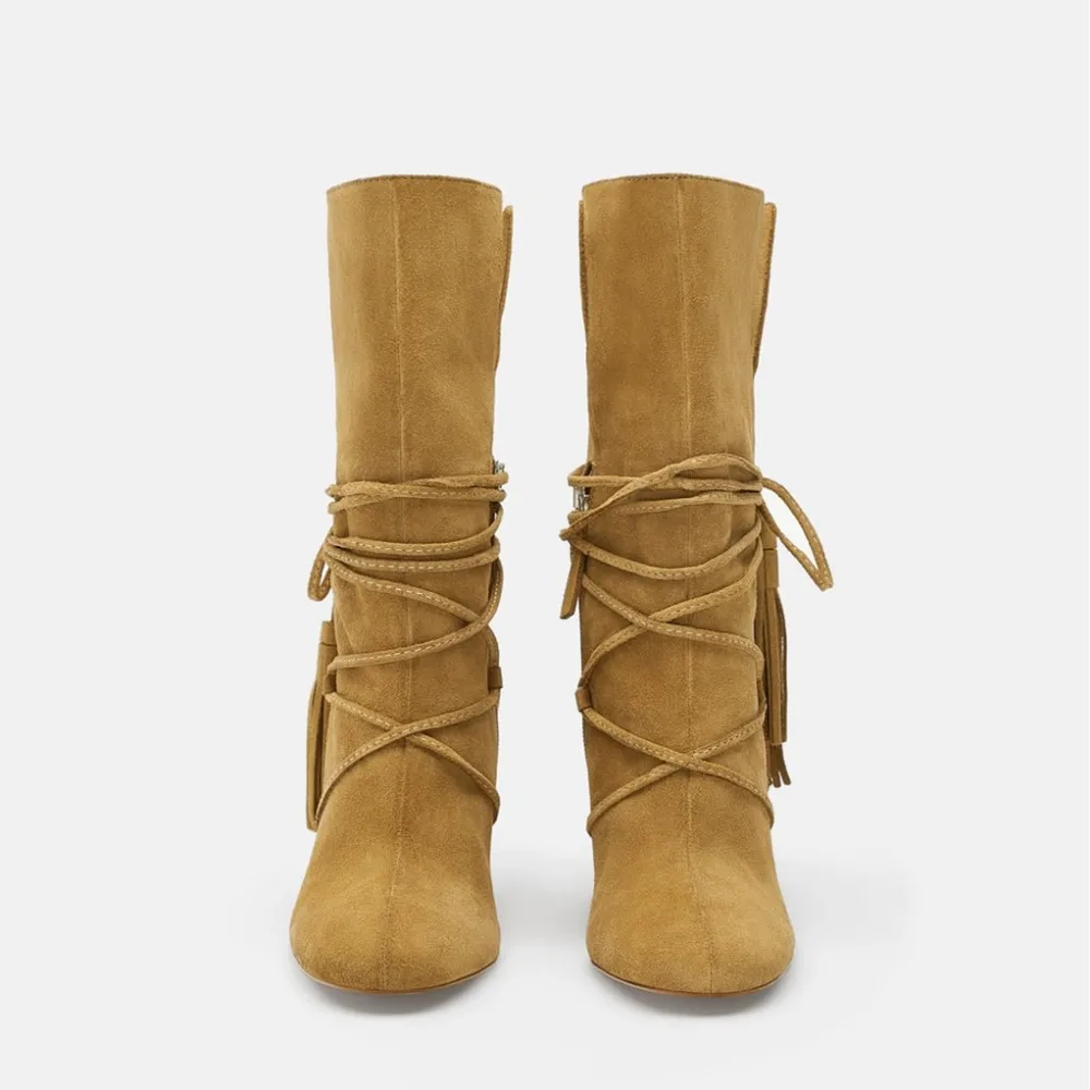 MANRINO-0299 Tan Color Tassel Decor Womens Zipper Up Block High Heel Combat Desert Boots 2019 Fashion Trends