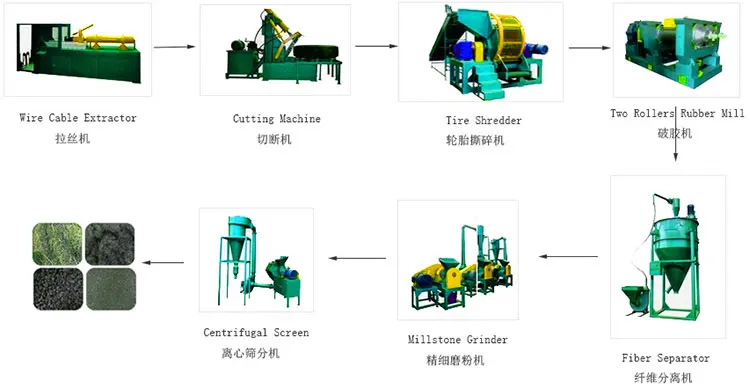 Complete separation | The rubber Crumbs, Steel and Fiber can be separated automatically. Adopt PLC control system, it is only needs 4-6 persons to operate a Tire recycling(granule)production line with 3000 kg/h capacity. Low energy consumption. The installed powder of Tire recycling production(granule)line with capacity 3000 kg/h is about 800 kw. |