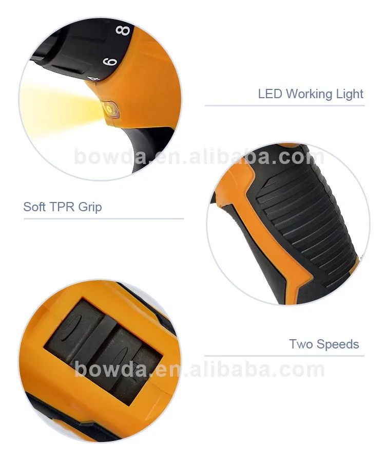 The cordless drill with LED light, LED power indicator,Li-ion battery, torque adjustment, variable switch, two-speed adjustment switch.