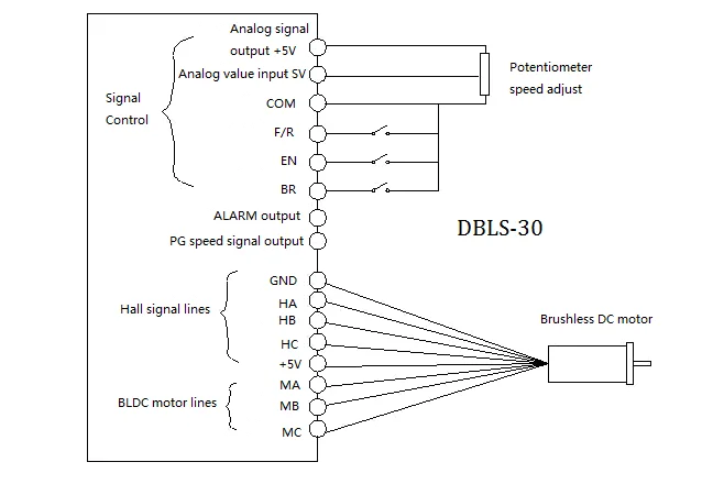Analog voltage adjustment speed: the terminals of external potentiometer connect to the +5v terminal in signal control and COM, connect the regulator terminal to SV, not only make it possible to adjust speed by external potentiometer (10K~100K), but also can achieve speed adjust through other control unit (Such as PLC, Microcontroller, etc) input analog voltage to SV. The acceptance of SV is DC 0V~+5V, and the corresponding motor rotate speed is 0 to rated speed.