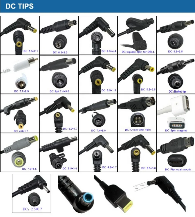 1). 5.5*2.1, 5.5*2.5, 3.5*1.35mm