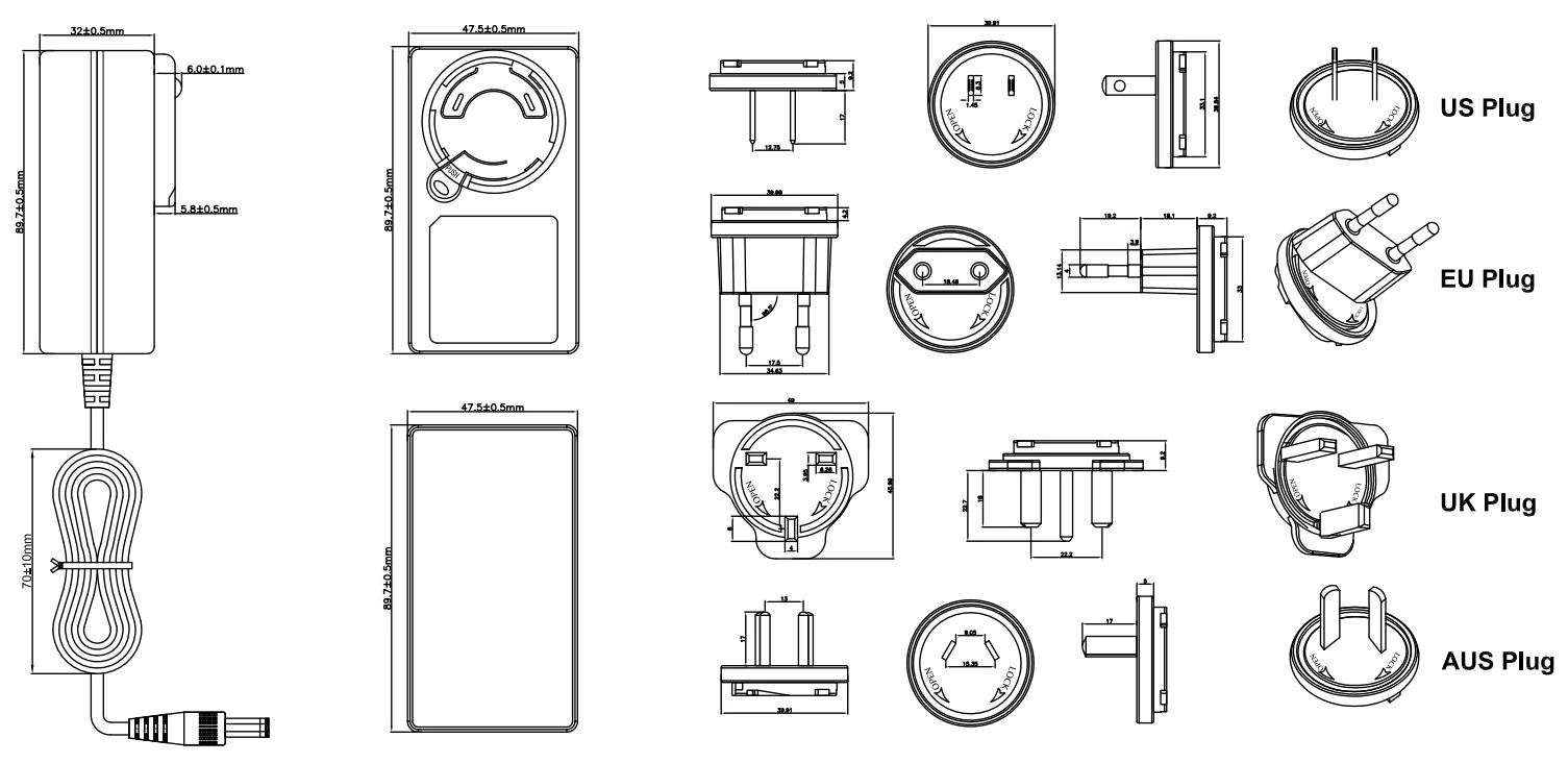 AC Plug Types | EU plug, US plug, UK plug, AU plug, JP plug, KC plug, CN plug (optional) |