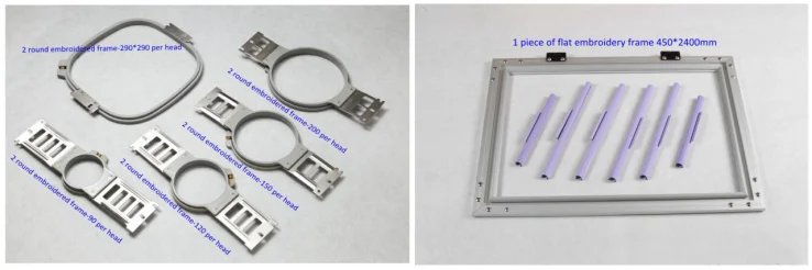 A. 2 sets of 9*9 cm T-shirt hoop per head Total: 16 sets B. 2 sets of 12*12 cm T-shirt hoop per head Total: 16 sets C. 2 sets of 15*15 cm T-shirt hoop per head Total: 16 sets D. 2 sets of 19*19 cm T-shirt hoop per head Total: 16 sets E. 2 sets of 29*29 cm T-shirt hoop per head Total: 16 sets F. 1 piece of Flat Embroidery Frame: 450*3200mm