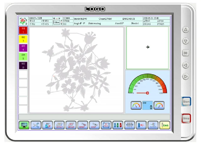 A.Suitable for flat embroidery, cap embroidery , finished garments embroidery and chain stitch embroidery B. Free changing between finished garments frame ang cap frame C.Pattern auto rotation with 180°after changing cap frame unit D.270° wide cap frame unit E. Maximum speed 1200 RPM F. Color LCD display showing real time stitching G. USB input port with fast data transmission and good compatibility H. Auto star and color change,200 times color change seted I. Thread break detection J. Pre-sew design trace capable K. Memory size 2, 000, 000 stitches L. Emergency stop ,Prevent accidents M. Electricity: AC86-264V input available N. Built-in bobbin winder O. Keeping current data or work when emergency stop or power off P. Mending function. (back and skip stitches under controller) Q. Switch of Cap/ flat embroidery mode eliminating hitting the frame. R. Mainboard intergated into control panel protecting from dust or external force. S. Lay-out of keys on panel is user-friendly. T. Built-in Network