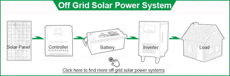 The off-grid solar power system is a kind of energy-saving and environmental protection product. The working principle is: Solar panels absorb sunshine and transfer into electricity, then store in the battery bank, provide the electricity for home load, such as lamp, TV, DVD, Fan, etc.