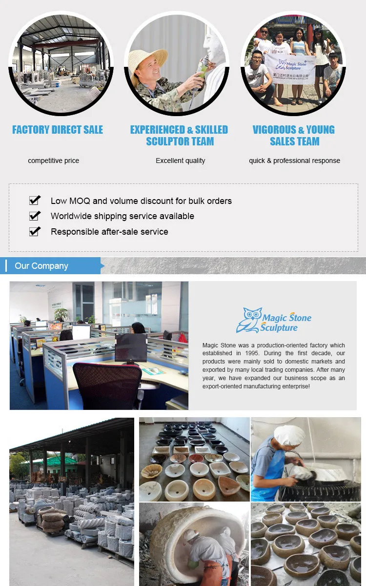 Magic Stone owns two factories which are located in Quanzhou city. Besides, we cooperate with another three factories in North of China, to provide wide range of stone sculptures for clients, thus competitive price and high standard quality can be ensured. Magic Stone are especially professional in produce stone garden birdbath, animal ornaments, water fountains, basalt garden landscapes, etc.