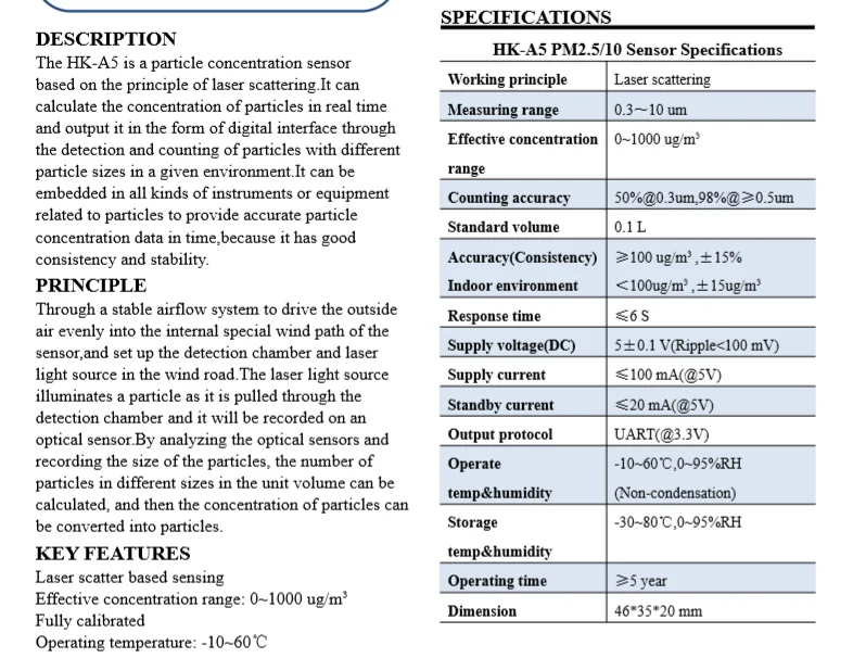 Hk-A5 is a digital universal particulate concentration sensor, which is used to obtain the number of suspended particulate matter (particulate concentration) of 0.3 to 10 microns per unit volume in the air, and output it in the form of a digital interface, as well as the mass data of each particle.The sensor can be embedded into various instruments (related to calculating the concentration of suspended particulate matter in the air) and environmental improvement equipment to provide timely and accurate data.