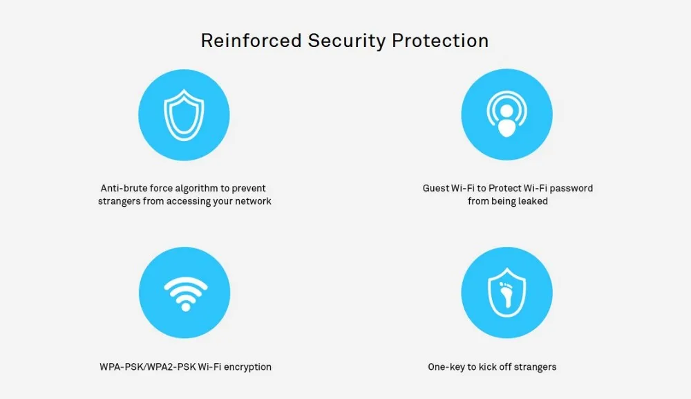 Anti-brute force algorithms, WPA-PSK / WPA2-PSK Wi-Fi encryption, firewall, DMZ, PAP / CHAP, DoS attack protection